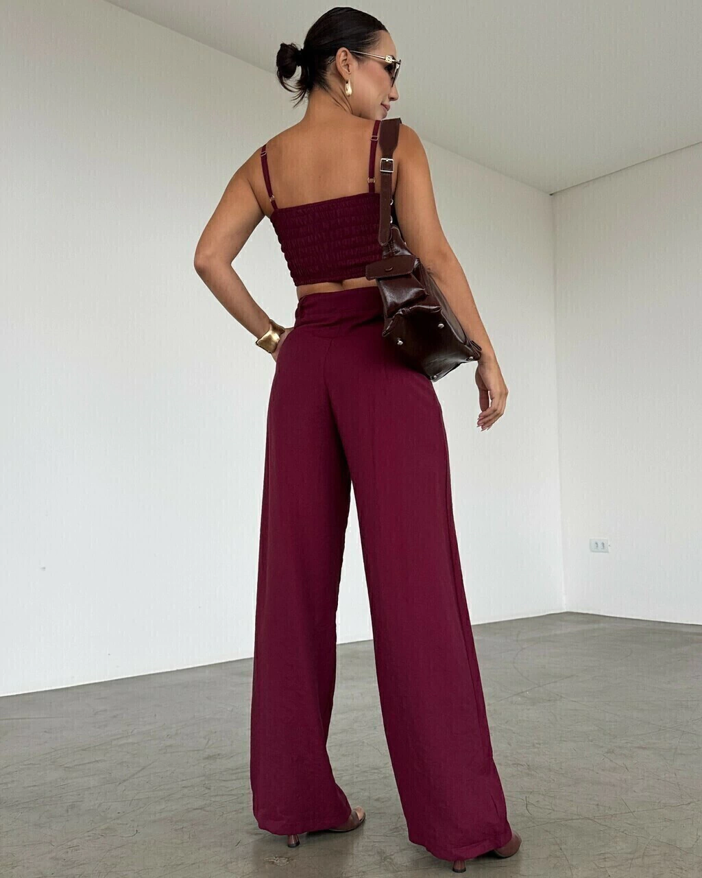 A calça possui fechamento em dois botões acompanhados de ziper, posui cós alto, bolsos facas, passadores de cinto, e tem uma modelagem mais reta.